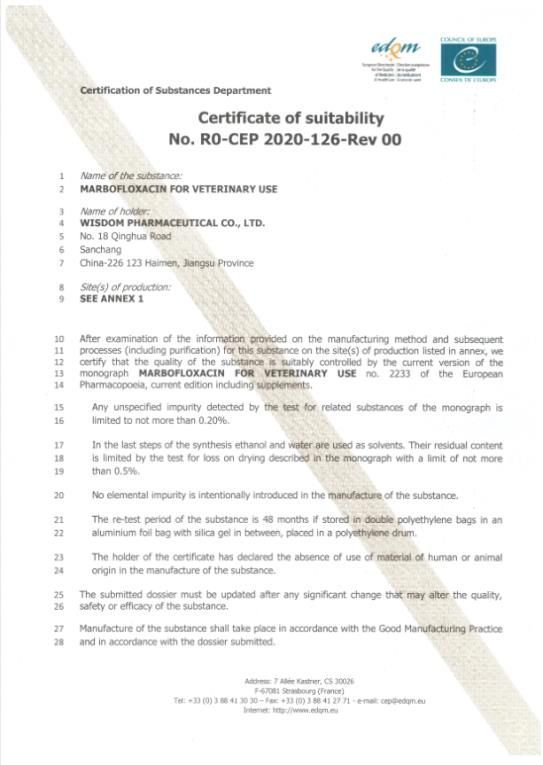 2021年9月21日,江苏米兰平台-米兰官方网站(中国)药业有限公司通过EDQM的技术审批,获马波沙星CEP证书。